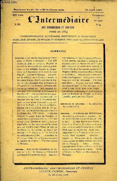 L'INTERMEDIAIRE DES CHERCHEURS ET CURIEUX. 30 AVRIL 1892. In-12. Broché. Bon état, Couv. convenable, Dos satisfaisant, Intérieur frais. Questions de 401 à 411. Réponses de 411 à 432. Lectures en colonnes.. . . . Classification Dewey : 1-Le savoir
