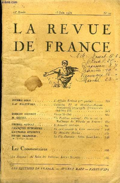 Sommaire : PIERRE BOST. L’Affaire Levioux (ire partie).J.-P. PALEWSKI. Catherine II et Stanislas- AugustePoniatowski (1754-1798). (Documents inédits) (II)..ROBERT HESMOT...Presqu'île (fin)..M. GEIBEL...Un Problème national : Où en est leRaffinage du Pétrole en France ? PIERRE AUDIAT . L’Actualité littéraire. ...FRANÇOIS HERBETTE. En quoi consiste la Crise américaine ?RAYMOND RECOULY. Le Ministere Herriot...HENRI BREMOND de l’Académie française.. La Vie Courante : Selon Saint Luc. . Classification Dewey : 70.49-Presse illustrée, magazines, revues