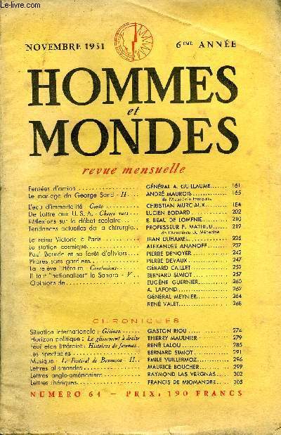 "Sommaire : Pensées d'action.. GÉNÉRAL A. GUILLAUME...Le mariage de George Sand. ANDRÉ MAUROIS.de l'Académie FrançaiseL'eau d'immortalité - Conte... CHRISTIAN MURCIAUX.De Lattre aux U. S. A. - Choses vues. LUCIEN BODARDRéflexions sur le débat scolaire.. E. BEAU DE LOMENIE.Tendances actuelles de la chirurgie.. PROFESSEUR P. MATHIEU.de l'Académie de MédecineLa reine Victoria à Paris... JEAN DUHAMEL.La station cosmique. ALEXANDRE ANANOFF.Paul Bourde et sa forêt d'oliviers. PIERRE DENOYER...Phares sans gardiens... PIERRE DEVAUXLa relève littéraire - Conclusions... GÉRARD CAILLET...Il faut ""nationaliser"" le Sahara - V. BERNARD SIMIOT..Opinions de.. EUGÈNE GUERNIERA. LAFOND.GÉNÉRAL MEYNIER.RENÉ VALETCHRONIQUESSituation internationale : Gésines... GASTON RIOUHorizon politique: Le glissement à droite. THIERRY MAULNIER.Feuilleton littéraire: Histoires de femmes.. RENÉ LALOU..Les spectacles- BERNARD SIMIOT..Musique : Le Festival de Besançon - II.. EMILE VUILLERMOZ.Lettres allemandes. MAURICE BOUCHER...Lettres anglo-américaines... RAYMOND LAS VERGNAS.Lettres ibériques... FRANCIS DE MIOMANDRE. Classification Dewey : 70.49-Presse illustrée, magazines, revues"