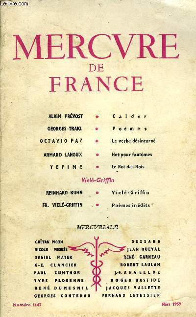 Sommaire : ALAIN PRÉVOST. Calder. GEORGES TRAKL. Poèmes. OCTAVIOPAZ. Le verbe désincarné. ARMAND LANOUX. Hot pour fantômes. YEFIME. Le Roi des Rois. Vielé-Griffin REINHARD KUHN. Vielé-Griffin. FR. VIELÉ-GRIFFIN. Poèmes inédits. Classification Dewey : 70.49-Presse illustrée, magazines, revues