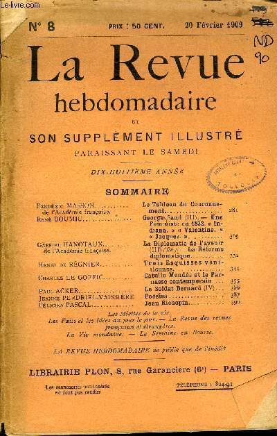 Romans, histoire, voyages et supplément illustré. Sommaire : Frédéric MASSON de l’Académie française. Le Tableau du Couronnement.René DOUMIC. George Sand (III).— Une Féministe en 1832. « Indiana. » « Valentine. »« Jacques. ».Gabriel HANOTAUX de l'Académie française. La Diplomatie de l’avenir (III) (fin).— La Réforme diplomatique.Henri de RÉGNIER. Trois Esquisses vénitiennes.. Charles LE GOFFIC.. Catulle Mendès et le Parnasse contemporain ...Paul ACKER.. Le Soldat Bernard (IV)...Jeanne PERDRIEL-VAISSIÈRE. Poésies..Félicien PASCAL..Jean Richepin Classification Dewey : 70.49-Presse illustrée, magazines, revues
