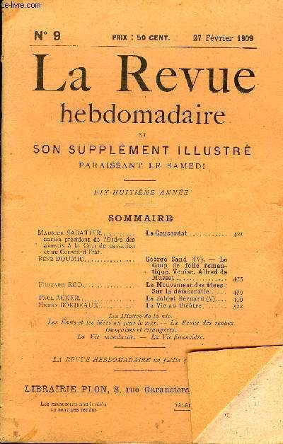 Romans, histoire, voyages et supplément illustré. Sommaire : Maurice SABATIER ancien président de l’Ordre des avocats à la Cour de cassation et au Conseil d’Etàt. Le Concordat. René DOUMIC George Sand (IV). —Le Coup de folie romantique. Venise. Alfred deMusset.Edouard ROD. LeMouvement des idées :Sur la démocratie..Paul ACKER.. LeSoldat Bernard (V).Henry BORDEAUX. La Vie au théâtre Classification Dewey : 70.49-Presse illustrée, magazines, revues