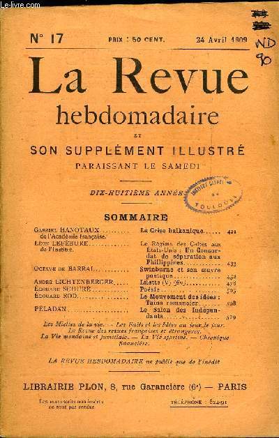 Romans, histoire, voyages et supplément illustré. Sommaire : Gabriel HANOTAUX de l’Académie française. La Crise balkanique..Léon LEFÉBURE de l’Institut. Le Régime des Cultes aux États-Unis : Un Concordat de séparation aux Phillippines.Octave de BARRAL. Swinburne et son œuvre poétique...André LICHTENBERGER. Lilette (V) (fin). Édouard SCHURÉ. Poésia. Édouard ROD. Le Mouvement des idées :Taine romancier. PÊLADAN. Le Salon des Indépendants.. Classification Dewey : 70.49-Presse illustrée, magazines, revues