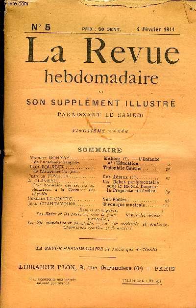Romans, histoire, voyages et supplément illustré. Sommaire : Maurice DONNAY de l’Académie française. Molière (I). —L’Enfance et l’Education..Paul BOURGET de l'Académie française. Théophile GautierJean de FOVILLE. Les Adieux (II)—...A. CLAVEAU Chef honoraire des secretaires rédacteurs à la Chambre des députés. Un Débat parlementaire SOUS le second Empire .la Propriété littéraire.,Charles LE GOFFIC... Nos Poètes...Jean CHANTAVOINE. Chronique musicale.. Classification Dewey : 70.49-Presse illustrée, magazines, revues
