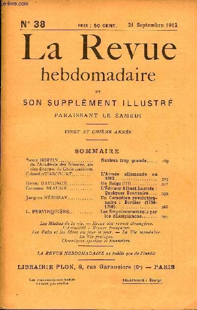 Romans, histoire, voyages et supplément illustré. Sommaire : Émile BERTIN de l’Académie des Sciences, ancien directeur du Génie maritime. Navires trop grands.Colonel d’HARCOURT.. L’Armée allemande en 1912.Henri DAVIGNON. Un Belge (III)Georges BEAUME. L’Éditeur Albert Lacroix :Quelques Souvenirs.Jacques HÉRISSAY. Un Comédien révolution-naire : Bordier (1758-1789)...L. PERVINQUIÈRE.. Les Empoisonnements parles champignons. Classification Dewey : 70.49-Presse illustrée, magazines, revues