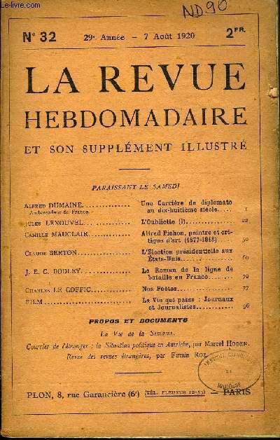 Romans, histoire, voyages et supplément illustré. Sommaire : Alfred DUMAÏNE Ambassadeur de France. Une Carrière de diplomate au dix-huitième siècle.Jules LENOUVEL. L’Oubliette (I). Camille MAUCLAIR. Alfred Pichon, peintre et critique d’art (1877-1918).Claude BERTON. L’Élection présidentielle aux États-Unis—.J. E. C. BODLEY.. Le Roman de la ligne debataille en FranceCharles LE GOFFIC. Nos Poètes...FILM. La Vie qui passe : Journauxet Journalistes Classification Dewey : 70.49-Presse illustrée, magazines, revues