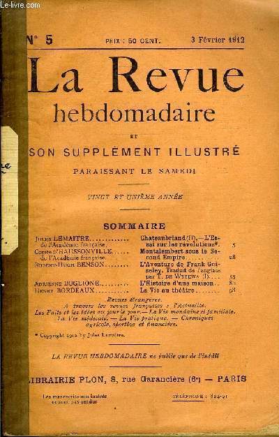 Sommaire : JuLEs LEMAITRE de l’Académie française. Chateaubriand (II).— L’Essai sur les révolutions.Comte d’HAUSSONVILLE de l’Académie française. Montalembert sous le Second Empire...Robert-Hugh BENSON. L’Aventure de Frank Guiseley. Traduit de l’ang-lais par T. de Wyzewa (I)Adrienne BOGLIONE.. L'Histoire d’une maison..Henry BORDEAUX... La Vie au théâtre. Jules LEMAITRE de l'Académie française. Chateaubriand (III). — Les Natchez; Atala.Fernand LAUDET. Augustin Gochin..Robert-Hugh BENSON. L’Aventure de Frank Guiseley. Traduit de l’anglais par T. de Wyzewa (II). ..Abbé Augustin SICARD. Grandes abbayes, grandes abbesses à la veille de la Révolution..Hélène VACARESCO. Poèmes..Paul ADAM. L’oeuvre de M. Henry Roujon. Paul BOURGET de l’Académie française. L’Art de Sully Prudhomme...Jules LEMAITRE de l’Académie française. Chateaubriand (IV). — René.Robert-Hugh BENSON. L’Aventure de Frank Guiseley.Traduit de l'anglais par T. de Wyzewa (III)..Comtesse de COURSON. La Tragédie de Cawnpore...André CHAUMEIX. Le Mouvement des Idées :les Idées de M. Henry Bordeaux. Gabriel HANOTAUX de l’Académie française. L’Angleterre, l’Allemagne et la France.Ernest DAUDET. La Jeunesse d’Alphonse Daudet..Jules LEMAITRE de l'Académie française.. Chateaubriand (V).— Le Génie du Christianisme.Robert-Hugh BENSON. L’Aventure de Frank Guiselay.Traduit de l’anglais par T. DE Wyzewa (IV)..Docteur GRASSET Professeur à l’Université de Montpellier. Les Criminels peints par eux- mêmes***.. La Tunisification Classification Dewey : 70.49-Presse illustrée, magazines, revues