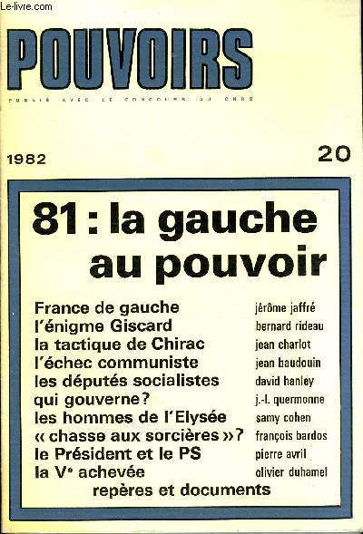 Sommaire : 1981 :la gauche au pouvoirLA CONQUÊTE DU POUVOIRJérôme JaffrÉ. — De Valéry Giscard d’Estaing à François Mitterrand : France de gauche, vote de gauche.Bernard Rideau. — L’énigme Giscard.Jean Charlot. — Les consultations d’avril-juin 1981 et Jacques Chirac .Jean Baudouin. — L’échec communiste de juin 1981 : recul électoral ou crise hégémonique..David Hanley. — Les députés socialistesL’EXERCICE DU POUVOIRJean-Louis Quermonne. — Le gouvernement présidentiel ou un gouvernement partisan ?Samy Cohen. — Les hommes de l’ElyséeFrançois Bardos. — Les fonctionnaires et le pouvoir politique.. .Pierre Avril. — Le Président, le parti et le groupe..Olivier Duhamel. — 1981, la Ve achevée. Sur dix caractéristiques du régime..Jean Gicquel. — Repères et documents. Classification Dewey : 70.49-Presse illustrée, magazines, revues