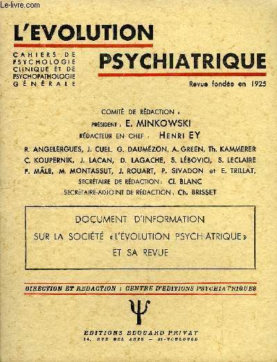 "Cahiers de psychologie clinique et de psychopathologie générale. Sommaire : Conditions d'abonnement / Subscription rates, The Society ""L'evolution psychiatrique"" and its Journal / La Société ""L'évolution psychiatrique"" et sa Revue, Répertoire des principaux articles parus, Sommaire des numéros de l'évolution psychiatrique 1968. Classification Dewey : 150-Psychologie"