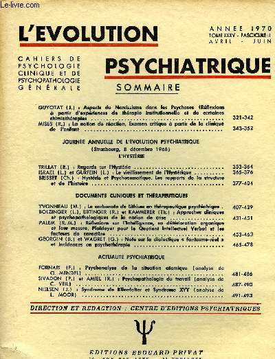 Cahiers de psychologie clinique et de psychopathologie générale. Sommaire : GUYOTAT (J.) : Aspects du Narcissisme dans les Psychoses (Réflexions à partir d’expériences de thérapie institutionnelle et de certaineschimiothérapies ..MISES (R.) : La notion de réaction. Examen critique à partir de la clinique de l’enfant .JOURNÉE ANNUELLE DE L’ÉVOLUTION PSYCHIATRIQUE (Strasbourg, 8 décembre 1968)L’HYSTÉRIETRILLAT (E.) s Regards sur l’Hystérie ISRAËL(L.) et GURFEIN (L.) : Le vieillissement de l’Hystérique.BRiSSET(Ch.) : Hystérie et Psychosomatique. Les rapports de lastructureet de l’histoire ..DOCUMENTS CLINIQUES ET THÉRAPEUTIQUESYVONNEAU ( M. ) : Le carbonate de Lithium en thérapeutique psychiatrique . BOLZINGER (L.), EBTINGER (R.) et KAMMERER (Th.) s Approches cliniqueset psychopathologiques de la notion de crise PALEM( R. M. ) : Réflexionssur l’Intelligence, sa détérioration organiqueet leur mesure. Plaidoyer pour le Quotient Intellectuel Verbal et lesfacteurs de caractère ..GEORGIN (B.) et WAGRET (G.) : Note sur la dialectique « fantasme-réel » et incidences en psychothérapie ACTUALITÉ PSYCHIATRIQUEFORNARI (F.) : Psychanalyse de la situation atomique (analyse deG. MENDEL) ..SIVADON (P.) et AMIEL (R.) : Psychopathoiogie du travail (analyse deC. VEIL) .NIELSEN (J.) : Syndrome de Klinefelter et Syndrome XYY (analyse de L. MOOR) .. Classification Dewey : 150-Psychologie