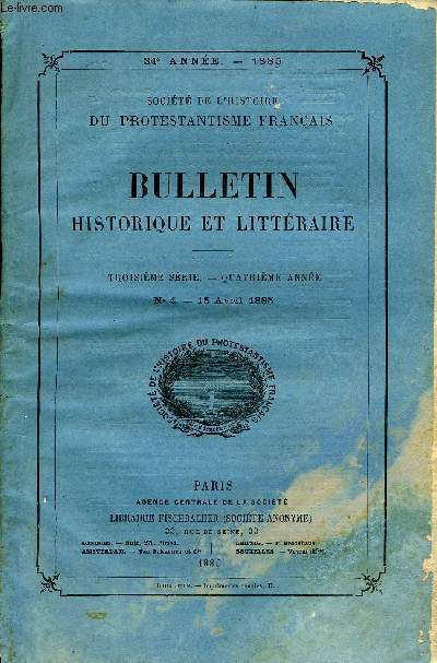 AGENCE CENTRALE DE LA SOCIETE. 15 AVRIL 1885. In-12. Broché. Bon état, Couv. convenable, Dos satisfaisant, Intérieur frais. Paginé de 145 à 192.. . . . Classification Dewey : 284-Protestantisme