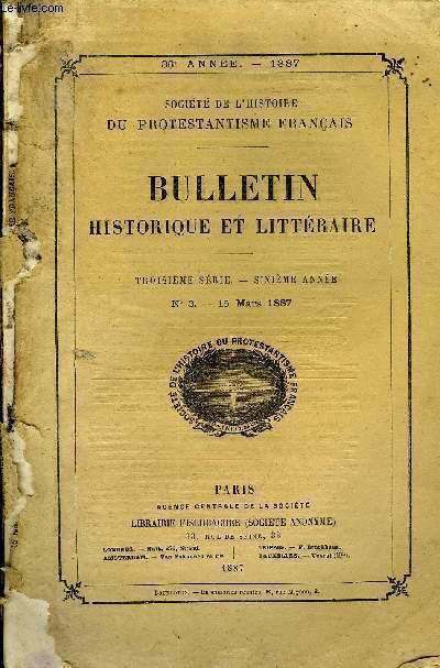AGENCE CENTRALE DE LA SOCIETE. 15 MARS 1887. In-12. Broché. Bon état, Couv. convenable, Dos satisfaisant, Intérieur frais. Paginé de 113 à 168.. . . . Classification Dewey : 284-Protestantisme