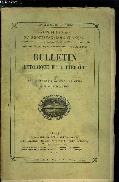 AGENCE CENTRALE DE LA SOCIETE. 15 aout 1890. In-12. Broché. Bon état, Couv. convenable, Dos satisfaisant, Intérieur frais. Paginé de 393 à 448.. . . . Classification Dewey : 284-Protestantisme