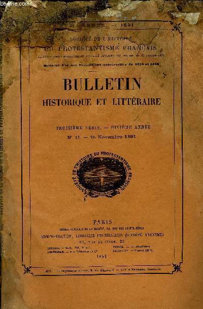 AGENCE CENTRALE DE LA SOCIETE. 15 NOVEMBRE 1891. In-12. Broché. Bon état, 1er plat abîmé, Dos satisfaisant, Intérieur frais. Paginé de 561 à 616.. . . . Classification Dewey : 284-Protestantisme