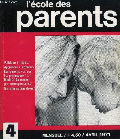 Sommaire : La même civilisation ?, La politique à l'école par colette Dartois. Comment les professeurs voient-ils les parents ?. Histoire d'une bande dessinée par Michelle de Wilde. Apprendre à attendre par H-S. Arnstein. La fidélité par Jean Gondonneau. Un appel à l'aide : la lettre. Classification Dewey : 370-Education
