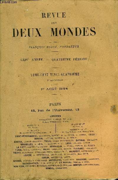 AU BUREAU DE LA REVUE DES DEUX MONDES. 1er AOUT 1894. In-12. Broché. Bon état, Couv. convenable, Dos satisfaisant, Intérieur frais. Paginé de 481 à 720.. . . . Classification Dewey : 70.49-Presse illustrée, magazines, revues