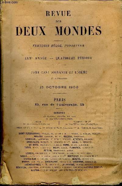 AU BUREAU DE LA REVUE DES DEUX MONDES. 15 OCTOBRE 1900. In-12. Broché. Bon état, Couv. convenable, Dos satisfaisant, Intérieur frais. Paginé de 721 à 960.. . . . Classification Dewey : 70.49-Presse illustrée, magazines, revues