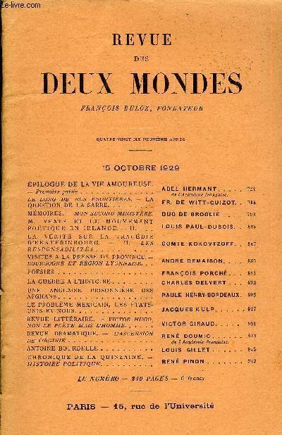 AU BUREAU DE LA REVUE DES DEUX MONDES. 15 OCTOBRE 1929. In-12. Broché. Bon état, Couv. convenable, Dos satisfaisant, Intérieur frais. Paginé de 721 à 960.. . . . Classification Dewey : 70.49-Presse illustrée, magazines, revues