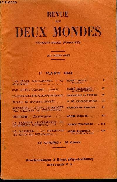 AU BUREAU DE LA REVUE DES DEUX MONDES. 1er MARS 1941. In-12. Broché. Bon état, Couv. convenable, Dos satisfaisant, Intérieur frais. Paginé de 1 à 128.. . . . Classification Dewey : 70.49-Presse illustrée, magazines, revues