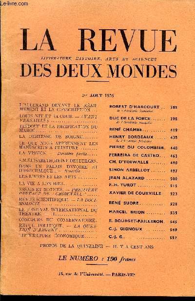 Sommaire : L’ALLEMAND DEVANT LE RÉARMEMENT ET LA CONSCRIPTION. ROBERT D’HARCOURT. de l’Académie françaiseLOUIS XIV ET SA COUR. — AVANT VERSAILLES. DUC DE LA FORCE. de l'Académie françaiseTINDOUF ET LA PACIFICATION DU MAROC. RENÉ CHAMBE..LA COMTESSE DE BOIGNE..HENRY BORDEAUX..de l'Académie française. CE QUE NOUS APPRENNENT LES MANUSCRITS A PEINTURE .PIERRE DU COLOMBIER.LA MISSION. — Dernière partie. FERREIRA DE CASTRO. S.M.ÉLISABETH, REINE DES BELGES. CH. D’YDEWALLE..DANS UN PALAIS D’IVOIRE ET D'ORICHALQUE - Nouvelle. SIMON ARBELLOT.LES LIVRES ET LES ARTS ..JEAN ALAZARDLA VIE A LONDRES..F.-H. TUROT.ESSAIS ET NOTICES. - PREMIÈRE PREFACE DE “ CROMWELL ”. XAVIER DE COURVILLE.REVUE SCIENTIFIQUE. — LA DOCIMOLOGIE .RENE SUDRELE FESTIVAL INTERNATIONAL DU THÉÂTRE. — II. MARCEL BRION. CONCOURS DU CONSERVATOIRE. R. BOURGET-PAILLERON.REVyE POLITIQUE. - LA QUESTION D’ARGENT. C. J- GIGNOUX.LITTÉRATURE ÉCONOMIQUE. C.-J. G Classification Dewey : 70.49-Presse illustrée, magazines, revues