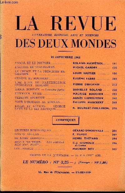 Sommaire : PASCAL ET LE POUVOIR. ROLAND MASPÉTIOL..L’AGONIE DE STALINGRAD. MICHEL GARDER. LE PRINCE ET LA PRINCESSE BAGRATION. - I. LOUIS HASTIER. GENÈVE ET ROUSSEAU. EUGÈNE FABRE .UNE MUSE DE MAETERLINCKGEORGETTE LEBLANC. PIERRE DESCAVES.MARIA BONPAIN. — Deuxième partie. DANIELLE ROLAND..HERMANN HESSE ..MAURICE BOUCHER .VEDETTE SPORTIVE .AGNÈS LAMOUREUX .TOUR D’HORIZON AU MORVAN. PHILIPPE MARCKERT .ESSAIS ET NOTICES. — GEORGE SAND ET LE SKI NAUTIQUE. R. BOURGET-PAILLERON. Classification Dewey : 70.49-Presse illustrée, magazines, revues