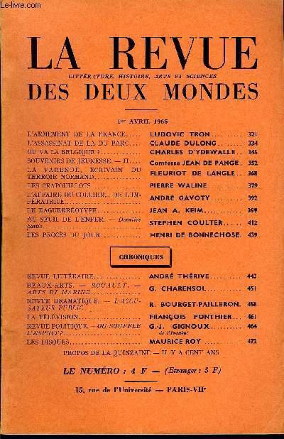 Sommaire : L'ARMEMENT DE LA FRANCE. LUDOVIC TRON.L’ASSASSINAT DE LA DU PARC. CLAUDE DULONG..OU VA LA BELGIQUE ?. CHARLES D’YDEWALLE ..SOUVENIRS DE JEUNESSE. - II. Comtesse JEAN DE PANGE .LA VARENDE, ÉCRIVAIN DU TERROIR NORMAND. FLEURIOT DE LANGLE. LES CRAPOUILLOTS. PIERRE WALINE..L’AFFAIRE DU COLLIER DE L’IMPÉRATRICE. ANDRÉ GAVOTY.LE DAGUERRÉOTYPE.. JEAN A. KEIM. AU SEUIL DE L’ENFER. — Dernière partie.. STEPHEN COULTER. LES PROCÈS DU JOUR. HENRI DE BONNECHOSE. Classification Dewey : 70.49-Presse illustrée, magazines, revues