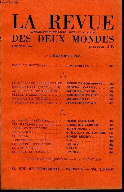 Sommaire : ROME EN MOUVEMENT.. LUC BARESTA.LE CENTENAIRE DE BAUDELAIRE. PIERRE DE BOISDEFFRE. INDOCHINE OCT. 45-MARS 47 (III).. GÉNÉRAL VALLUY..UN COURTISAN MALHEUREUX. JACQUES LEVRON..LETTRE D’AMÉRIQUE..EUGÈNE DE THASSY. PRÉSENCE DE VIRGILE. MAURICE RAT.L’ENFANCE DE JACOB, roman. JEAN ETHIER-BLAiS. Classification Dewey : 70.49-Presse illustrée, magazines, revues