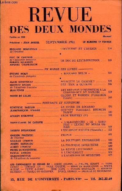 Sommaire : EDOUARD BONNEFOUS de l'Institut. L’OCCIDENT ET L’AVENIR. DUC DE CASTRIES ..PHILIPPE LANGER. LE DUC DE LEVIS-MIREPOIX. ARNAUD CHAFFANJON-EN MARGE DES LIVRES -ETIENNE WOLFF de l’Académie française. « EDOUARD BELIN ». ALAIN GRIOTTERAY .. POURQUOI LA GAUCHE? ..MAURICE DRUON de l'Académie française. LES JEUX A OLYMPIE .JEAN FOYER. LES BREVETS D’INVENTION A LACONFERENCE DE NAIROBI . PIERRE DE CALAN . GLOIRE ET PASSION D’ONEIROS(Conte) ..-PORTRAITS ET SOUVENIRS-GENEVIEVE TABOUIS. LE DINER DE LOCARNO ..JEAN-FRANÇOIS LEMAIRE .. GUSTAVE FLAUBERT, MEDECINPASSIF ..ARCADY STOLYPINE .. LEON TROTSKY (II) ..MARIE-CLAIRE DE CAZOTTE « L’ALEIJADINHO » LE « STRO-PIAT » GENIAL DU MINAS GERAIS .THIERRY DESJARDINS. L’ESCARGOT D’ALAIN (Nouvelle) .. Classification Dewey : 70.49-Presse illustrée, magazines, revues
