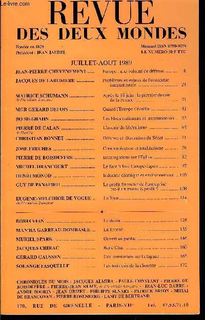 Sommaire : JEAN-PIERRE CHEVENEMENT. Europe : une volonté de défense .JACQUES DE LAROSIERE . Problèmes et enjeux de l'économieinternationale. MAURICE SCHUMANN de l'Académie française. Après le 18 juin : le premier devoir de la France ..MGR GERARD DEFOIS. Quand l'Europe s'éveille .BO SIEGBAHN. Les blocs nationaux et internationaux ..PIERRE DE CALAN de l'Institut. L'avenir du libéralisme. CHRISTIAN BONNET . Défense et illustration du Sénat ..JOSE FRECHES .. Communication et totalitarisme..PIERRE DE BOISDEFFRE.. Interrogations sur l'Eglise ..MICHEL DRANCOURT. Le face à face Europe-Japon.HENRI MONOD .. Industrie chimique et environnement ..GUY DE PANAFIEU . Le profit financier de l'entreprise est-il un mauvais profit ? EUGENE-MELCHIOR DE VOGUE .. La Tour..de l'Académie françaiseBORIS VIAN .. Le devin ..MAN'HA GARREAU-DOMBASLE . La licorne . MURIEL SPARK . Ouvert au public .JACQUES CHIRAC .. René Char ..GERARD GAUSSEN. Des aventuriers sur la laguneSOLANGE FASQUELLE .. Les trois cris de la chouette .. Classification Dewey : 70.49-Presse illustrée, magazines, revues