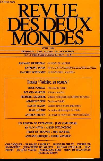 Sommaire : BERNARD DESTREMAU. LE SPORT ET L’ARGENT. RAYMOND POLIN. DE LA LAÏCITE CLASSIQUE A LA LAÏCITE ACTUELLE. MAURICE SCHUMANN. LE RETOUR DES « VALEURS ». Dossier : Voltaire, au secours ! RENE POMEAU. Présence de Voltaire. ROLAND MORTIER. Voltaire européen. FREDERIC DELOFFRE. Voltaire, l’orthographe et la défense du français. ALBRECHT BETZ. Goethe et Voltaire. HAYDN MASON. Voltaire dans le monde anglo-saxon. RENE DOUMIC. La carrière diplomatique de Voltaire. ANDREW BROWN. La Fondation Voltaire de l’université d’Oxford Classification Dewey : 70.49-Presse illustrée, magazines, revues