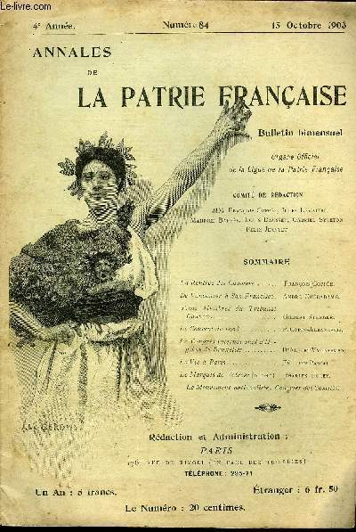 Sommaire : La Rentrée des Chambre. François Coppée.De Vancouver à San Francisco. André Chéradame.Trois Membres du Tribunat Daunou. Gilbert Stenger.Le Convent de 1903.. P. Copin-Albancelli.Le Congrès international d’Hy-giène de Bruxelles.. D1’Albert Vaudremer.La Vie à Paris.. Félicien Pascal.Le Marquis de Valrose (roman). Charles Foley.Le Mouvement nationaliste. Courrier des Comités. Classification Dewey : 70.49-Presse illustrée, magazines, revues