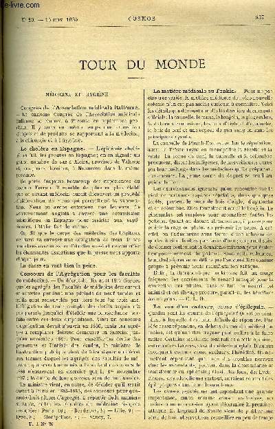 Sommaire : Congrès de l'association médicale italienne, Le choléra en Espagne, La matière médicale au Tonkin, Médecine vétérinaire, Immigration aux Etats-Unis, Une raie électrique, Les rats et l'exposition, L'eau dans le Sahara Classification Dewey : 70.49-Presse illustrée, magazines, revues