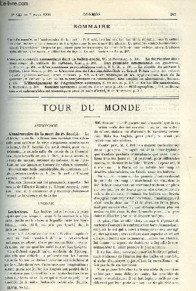 Sommaire : L'anniversaire de la mort du P. Secchi, Les huitres, Les bouchons rajeunis, Pour la culture du coton, Influence de la lumière de l'acétylène sur la croissance des plantes, La première conférence internationale du Transsibérien, Dispositif protecteur pour les tramways Classification Dewey : 70.49-Presse illustrée, magazines, revues
