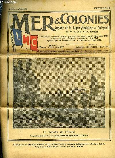 Bureau de la revue. Septembre 1931. In-12. Broché. Bon état, Couv. convenable, Dos satisfaisant, Intérieur frais. 16 pages. Nombreuses photographies en noir et blanc dans et hors texte.. . . . Classification Dewey : 386-Marine
