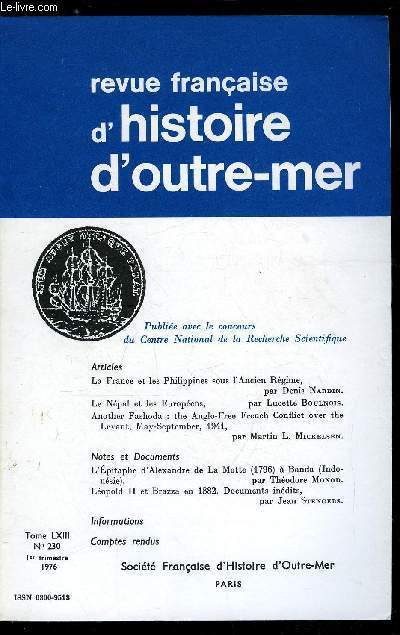 Sommaire : La France et les Philippines sous l'Ancien Régime par Denis Nardin, Le Népal et les Européens par Lucette Boulnois, Another Fashoda : the Anglo-Free French Conflict over the Levant, May-September 1941 par Martin L. Mickelsen, L'Epitaphe d'Alexandre de La Motte (1796) a Banda (Indonésie) par Théodore Monod Classification Dewey : 900-GEOGRAPHIE, HISTOIRE, SCIENCES AUXILIAIRES DE L'HISTOIRE