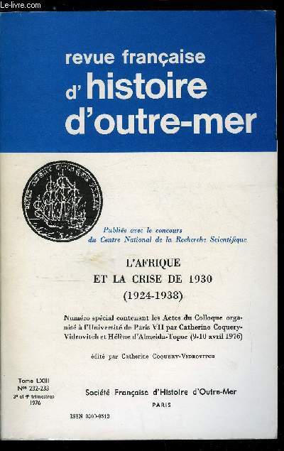 Sommaire : L'Afrique et la crise de 1930 - Avant propos par Catherine Coquery Vidrovitch, Problématique, méthodologie - Crise mondiale et crise coloniale autour de 1929 par Jean Bouvier, L'Afrique coloniale française et la crise de 1930 : crise structurelle et genèse du sous développement, rapport d'ensemble par Catherine Coquery Vidrovitch, Crise au Maghreb, remarques de méthode sur la vie rurale de 1929 a 1936 par André Nouschi Classification Dewey : 900-GEOGRAPHIE, HISTOIRE, SCIENCES AUXILIAIRES DE L'HISTOIRE