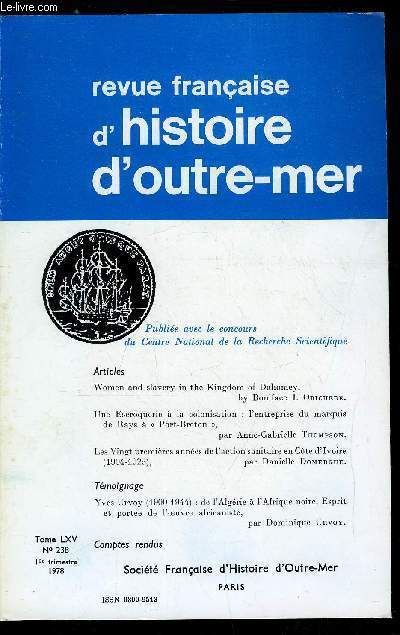 Sommaire : Women and slavery in the Kingdom of Dahomey par Boniface I. Obichere, Une escroquerie a la colonisation : l'entreprise du marquis de Rays a Port Breton par Anne Gabrielle Thompson, Les vingt première années de l'action sanitaire en Cote d'Ivoire par Danielle Domergue, Yves Urvoy (1900-1944) par Dominique Urvoy, De l'Algérie a l'Afrique Noire, Esprit et portée de l'oeuvre africaniste Classification Dewey : 900-GEOGRAPHIE, HISTOIRE, SCIENCES AUXILIAIRES DE L'HISTOIRE