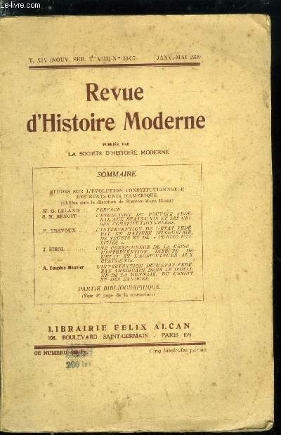 Sommaire : Etudes sur l'évolution constitutionnelle des Etats Unis d'Amérique, Préface par W.G. Leland, L'évolution du pouvoir fédéral aux Etats Unis et les crises constitutionnelles par S.M. Benoit, L'intervention de l'état fédéral en matière d'industrie, de trusts et de public utilities par F. Trevoux, Une conséquence de la crise : l'intervention directe de l'état et l'agriculture aux Etats Unis par J.Sirol Classification Dewey : 900-GEOGRAPHIE, HISTOIRE, SCIENCES AUXILIAIRES DE L'HISTOIRE