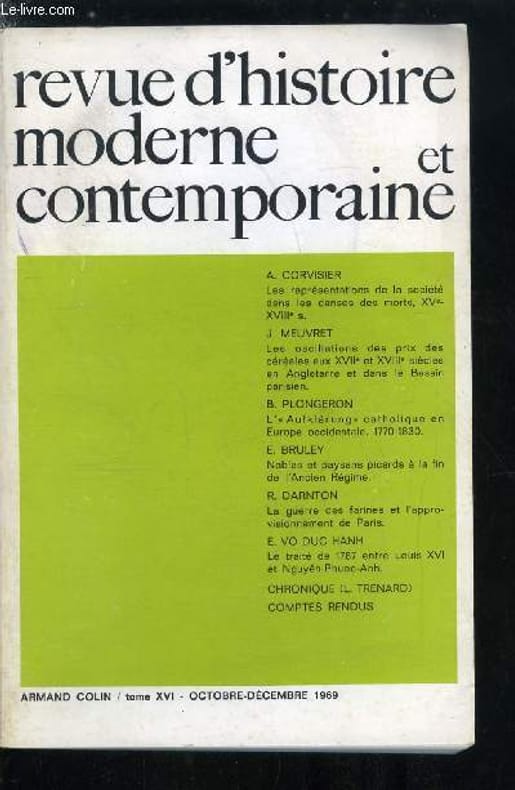 Sommaire : Les représentations de la société dans les danses des morts, XV-XVIIIe s. par A. Corvisier, Les oscillations des prix des céréales aux XVIIe et XVIIIe siècles en Angleterre et dans le bassin parisien par J. Meuvret, L'Aufklarung catholique en Europe occidentale, 1770-1830 par B. Plongeron, Nobles et paysans picards a la fin de l'ancien régime par E. Bruley Classification Dewey : 900-GEOGRAPHIE, HISTOIRE, SCIENCES AUXILIAIRES DE L'HISTOIRE
