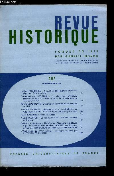 Sommaire : Nouvelles découvertes archéologique en Asie centrale par Héléna Kouzmina, Un document d'histoire sociale : le cahier de doléances de la ville de Moscou (printemps 1767) par François Xavier Coquin, L'exemple du tarif douanier français de 1910 par Raymond Poitevin Classification Dewey : 900-GEOGRAPHIE, HISTOIRE, SCIENCES AUXILIAIRES DE L'HISTOIRE