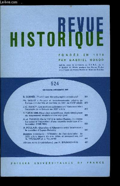 Sommaire : Y a-t-il une historigraphie médiévale ? par B. Guenée, Pouvoir et investissements urbains en Europe occidentale et centrale du XIIIe au XVIIe siècle par Ph. Wolff, Les archives judiciaires et l'histoire rurale : l'exemple de la Beauce au XIXe siècle par J.C. Farcy, 1868 Révolution scientifique, étude idéologique du mouvement révolutionnaire espagnol par Y. Turin Classification Dewey : 900-GEOGRAPHIE, HISTOIRE, SCIENCES AUXILIAIRES DE L'HISTOIRE