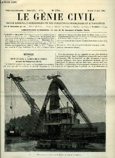 Sommaire : Grue derrick a vapeur de 62 tonnes du port de Valparaiso, La fabrication des conserves de viande pour le ravitaillement du camp retranché de Paris (suite et fin) par H. Copaux et André Kling, Perforatrices pneumatiques de construction américaine, Bateau porte pour les écluses du canal de Panama Classification Dewey : 624-Génie civil