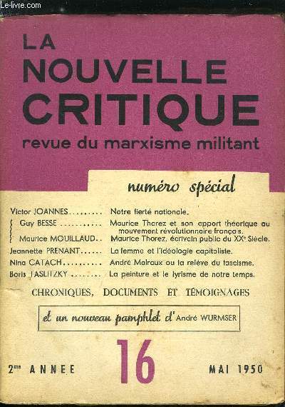 Sommaire : Notre fierté nationale par Victor Joannes, Maurice Thorez et son apport théorique au mouvement révolutionnaire français par Guy Besse, Maurice Thorez, écrivain public du XXe siècle par Maurice Mouillaud, La femme et l'idéologie capitaliste par Jeannette Prenant, André Malraux ou la relève du fascisme par Nina Catach Classification Dewey : 330-Economie