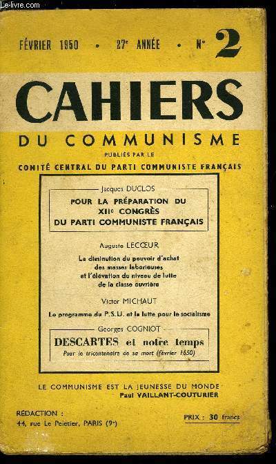 Sommaire : La préparation du XIIe congrès du Parti par Jacques Duclos, La diminution du pouvoir d'achat des masses laborieuses et l'élévation du niveau de lutte de la classe ouvrière par Auguste Lecoeur, Le programme du P.S.U. et la lutte pour le socialisme par Victor Michaut, L'union et laction de masse, moyen d'aboutir a des changements politiques par Raoul Calas, La marche des démocraties populaires vers le socialisme et la lutte contre la clique de Tito par Alfred Biscarlet Classification Dewey : 330-Economie