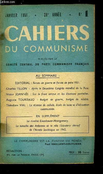 Sommaire : Forces de guerre et forces de paix 1951, Après le IIe congrès mondiale de la Paix par Charles Tillon, Sur le front unique et les élections partielles par Victor Joannes, Budget de guerre, budget de misère par Auguste Tourtaud, La part de la classe ouvrière dans le revenu national et les luttes revendicatives par Jean Bernard, La réunion de cellule, école de lutte et d'éducation communiste par Theodore Vial Classification Dewey : 330-Economie