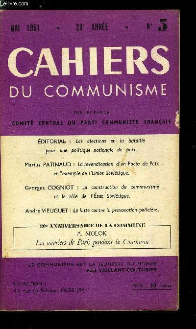 Sommaire : Les élections et la bataille pour une politique nationale de paix, La revendication d'un pacte de paix et l'exemple de l'union soviétique par Marius Patinaud, Les taches et les méthodes de notre propagande par Roger Garaudy, La construction du communisme et le role de l'Etat soviétique par Georges Cogniot, La luttre contre la provocation policière par André Vieuguet Classification Dewey : 330-Economie