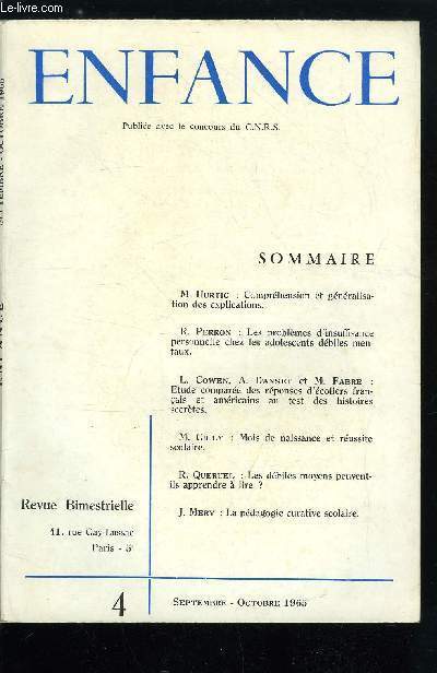 Sommaire : Compréhension et généralisation des explications par M. Hurtig, Les problèmes d'insuffisance personnelle chez les adolescents débiles mentaux par R. Perron, Etude comparée des réponses d'écoliers français et américains au test des histoires secrètes par L. Cowen, A. Danset et M. Fabre, Mois de naissance et réussite scolaire par M. Gilly Classification Dewey : 155.4-Psychologie de l'enfant