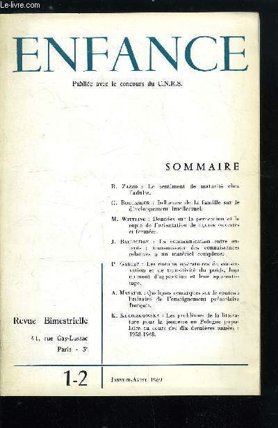 Sommaire : Le sentiment de maturité chez l'adulte par B. Zazzo, Influence de la famille sur le développement intellectuel par G. Boulanger, Données sur la perception et la copie de l'orientation de figures ouvertes et fermées par M. Wittling, La communication entre enfants : transmission des connaissances relatives a un matériel complexe par J. Baudichon, Les notions opératoires de conservation et de transitivité du poids, leur moment d'apparition et leur apprentissage Classification Dewey : 155.4-Psychologie de l'enfant