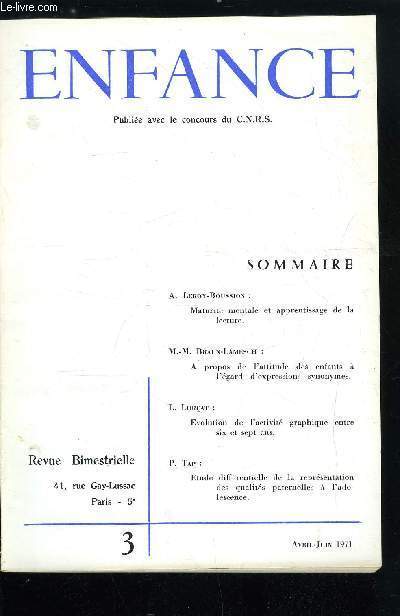 Sommaire : Maturité mentale et apprentissage de la lecture par A. Leroy-Boussion, A propos de l'attitude des enfants a l'égard d'expressions synonymes par M.M. Braun-Lamesch, Evolution de l'activité graphique entre six et sept ans par L. Lurçat, Etude différentielle de la représentation des qualités paternelles a l'adolescence par P. Tap Classification Dewey : 155.4-Psychologie de l'enfant