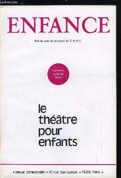 Sommaire : Situation du théatre pour enfants en France, Sources et modes d'information, Définition du théatre pour enfants, L'activité des troupes, La répartition géographique des troupes, Le public, Problèmes économiques du théatre pour enfants, Les créateurs et leurs créations Classification Dewey : 155.4-Psychologie de l'enfant
